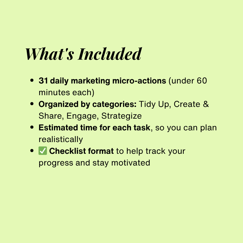 - 31 daily marketing micro-actions (under 60 minutes each)